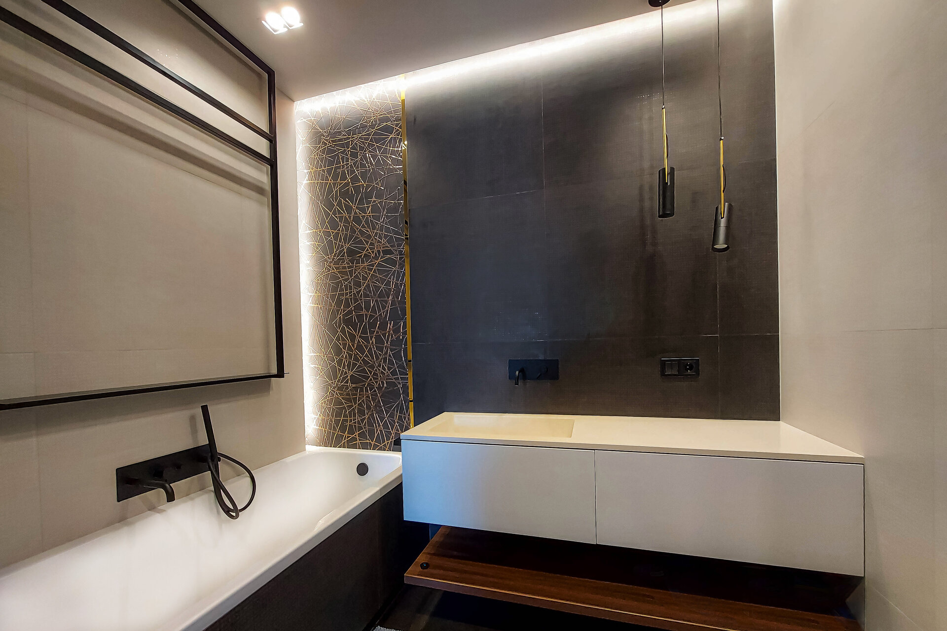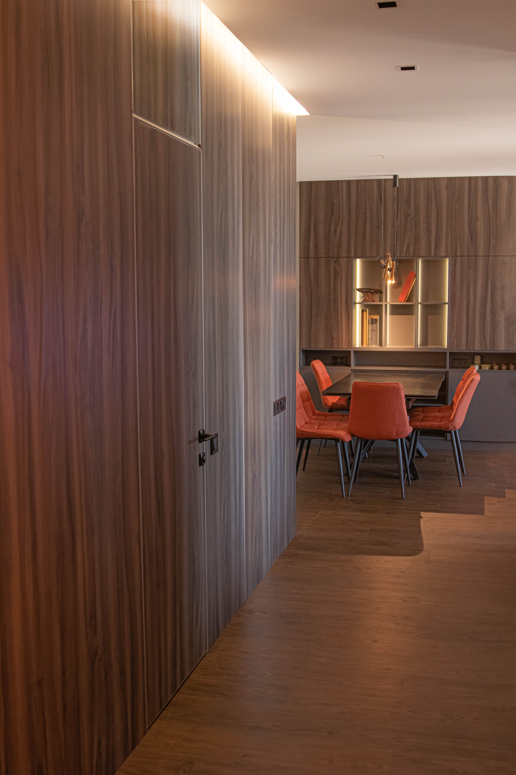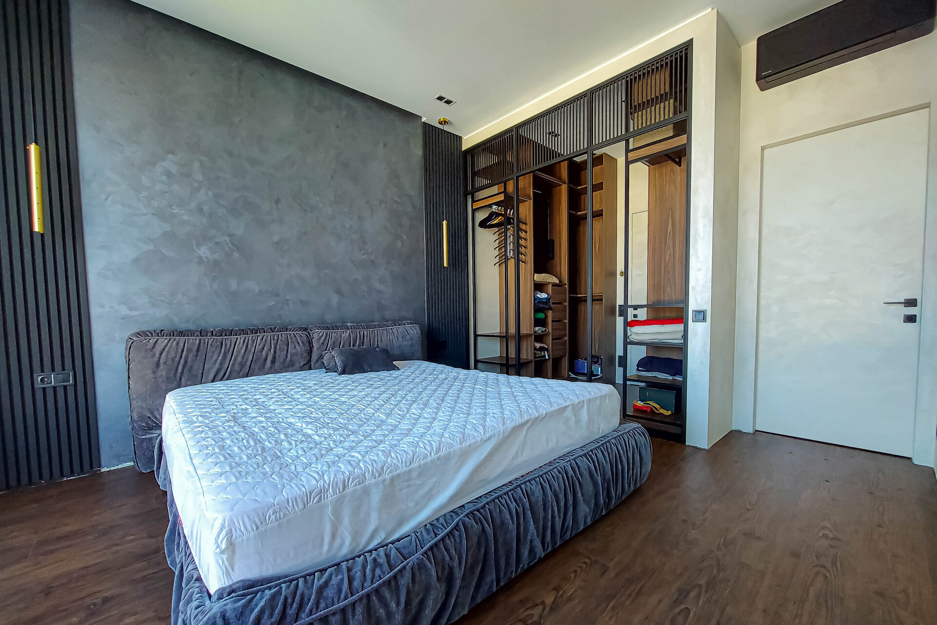 Основою її інтер’єру стала кухня, виготовлена з найкращих матеріалів – МДФ та великою кахельною стільницею. Відкрите планування між кухнею та вітальнею створює атмосферу гармонії та зручності. Стіни прикрашені гіпсовими та ламінованими ДСП-панелями, що надає квартирі стиль та сучасність. У квартирі є два санвузли: в одному з них ванна, в іншому – душ. Вбиральня надає організованості та комфорту. У квартирі дві просторі кімнати та великий хол, де покриття з плитки додає практичності та краси. Стеля з гіпсокартону, різноманітні джерела світла, двері прихованого монтажу та стильні чорні акценти роблять інтер’єр сучасним та оригінальним. Кожен елемент надає квартирі неперевершеної атмосфери стилю та комфорту.
